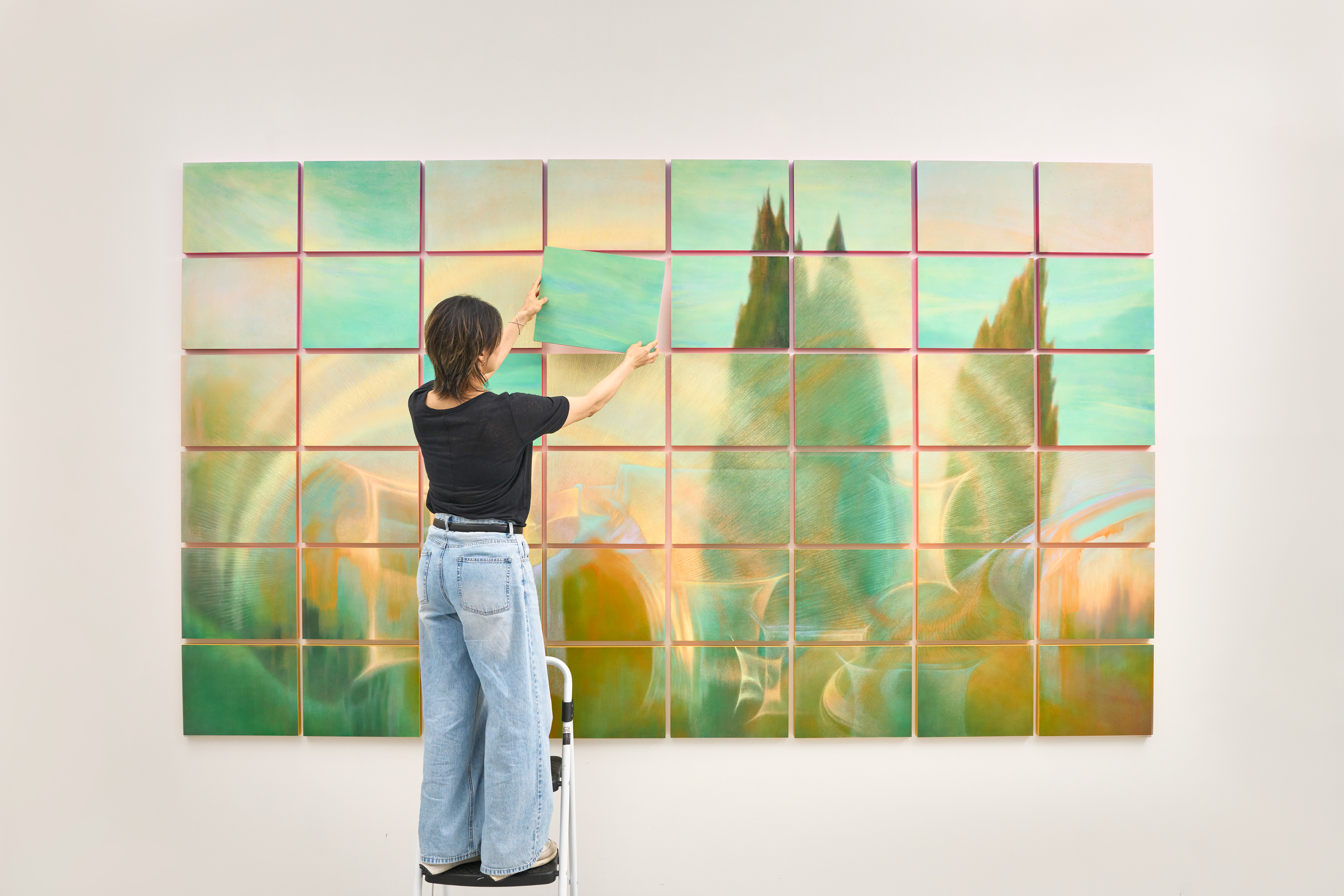 Whispering Slit 1, 2025, oil on wooden panel, 200.8x342cm (31.8x41cm 48pc each)